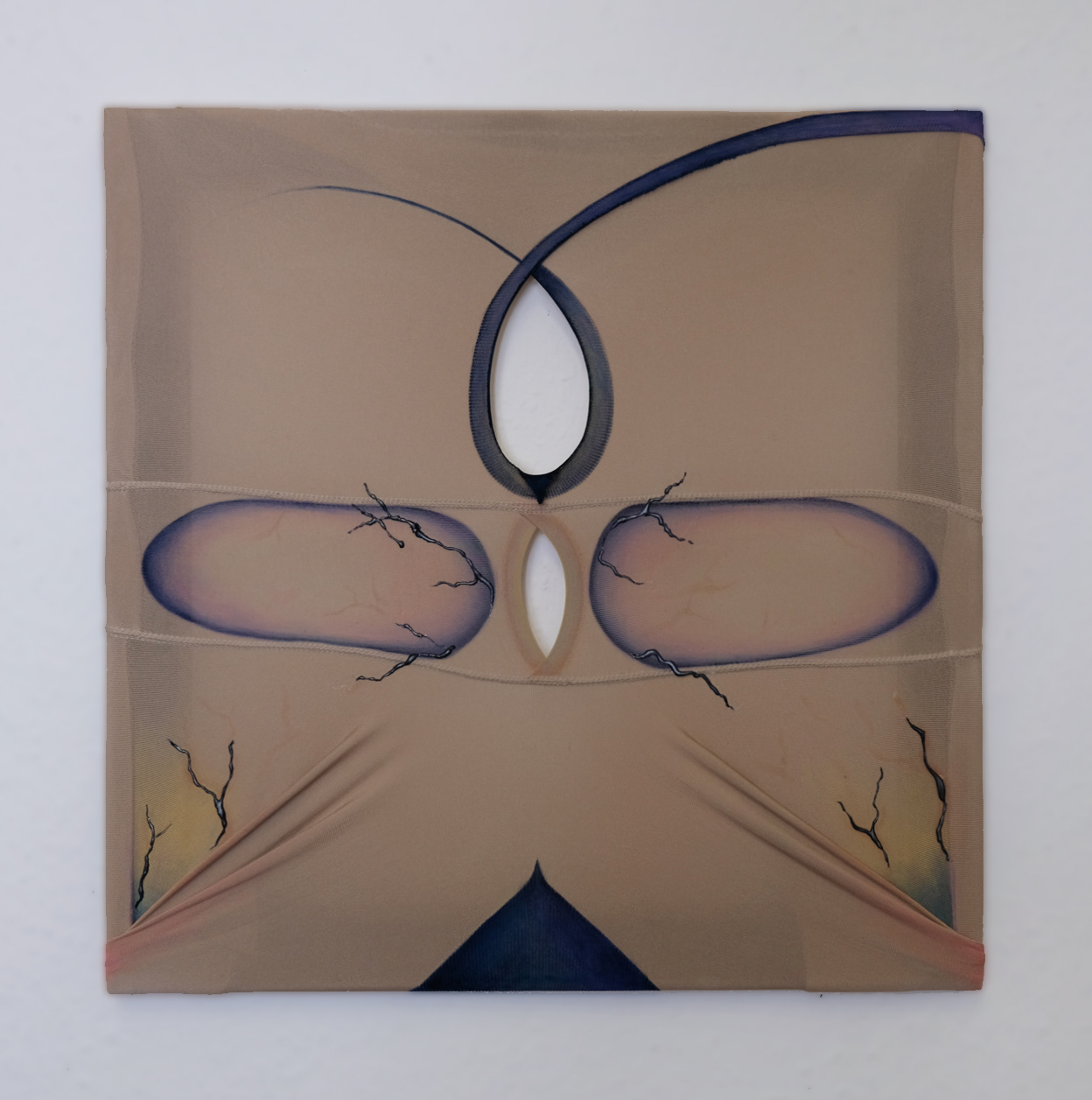 Flesh Against The Frame continues the mediation begun in Shape Capital. Wood, fabric, fasteners, seams, and straps merge into a new body that struggles with its limitations. The shapewear materials, once intended to invisibly contour and smooth body shapes under clothing, lose their character, are brought to the surface, exposed, laid bare, and fixed in a state of tension. Their elastic material stretches as it is forced into rectangular shapes. The wood of the stretcher frame is not a support, but a place of distortion. The painting lies over it, groping for contours that can no longer function. Form and color move between imitation and distortion of the old, occasionally swapping curvature and surface; searching for a new body language; negotiating their frame. The once tamed curves become part of new landscapes between tension and relief, renegotiating physicality: fixed form? fluid state?